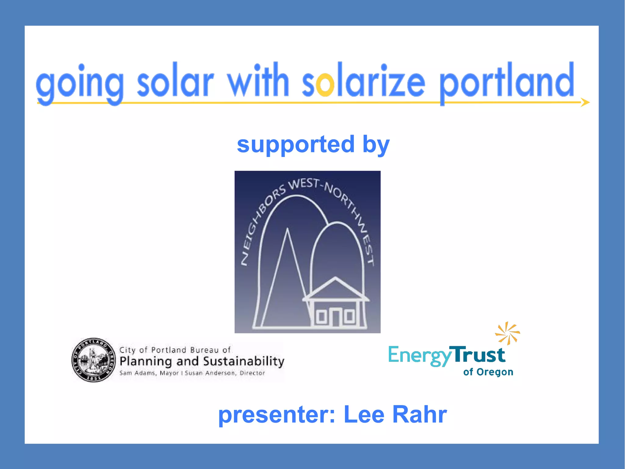 Solarize Northwest helps residents go solar through group purchasing. Interested neighbors join together to hire a contractor, purchase solar panels, and install them at a lower cost than individual installations. Participants attend local informational events and the selected contractor provides equipment, installation, and assistance through the whole process. Going solar as a group results in great savings from bulk purchasing of solar systems.