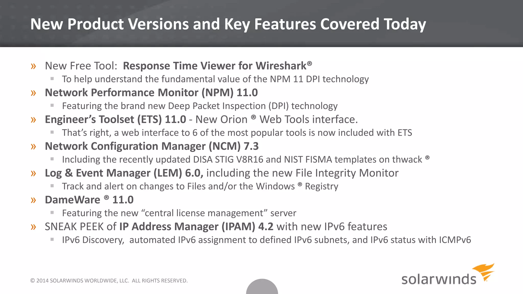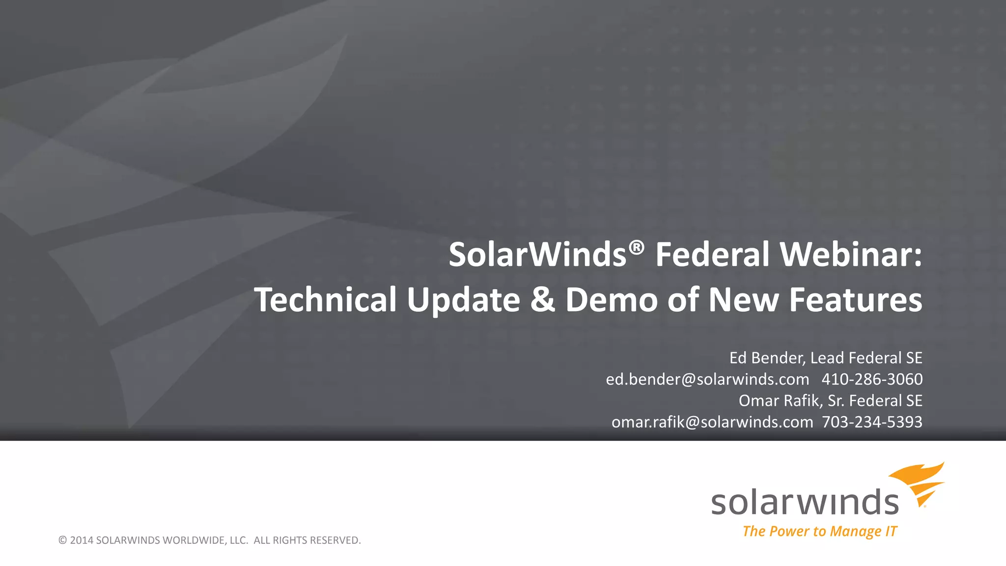 The document provides a technical update and demonstration of new features from SolarWinds for federal customers, including tools like the Response Time Viewer for Wireshark, updates to Network Performance Monitor, Engineer's Toolset, and Log & Event Manager. Key highlights include deep packet inspection and new compliance templates. Additionally, it showcases advancements in IPv6 features and centralized license management for Dameware.
