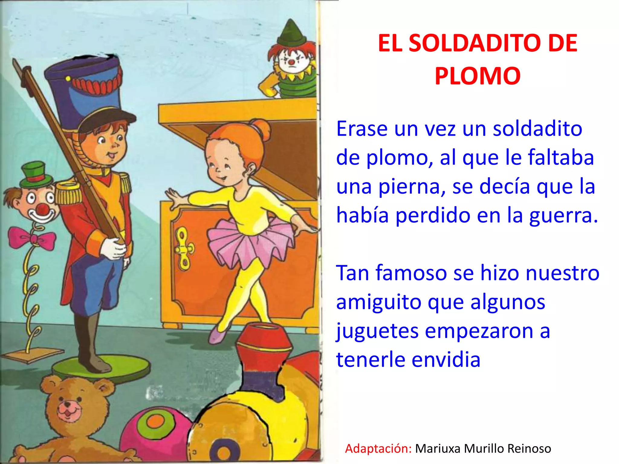Un soldadito de plomo sin una pierna se hizo famoso entre los juguetes hasta que el payaso Plinplin lo tiró a la basura por envidia. El perro Peluche encontró al soldadito y jugó con él hasta que lo dejó en la calle. Más tarde, unos niños lo pusieron a flotar en un barco de papel hasta que fue llevado por la corriente a un río. El hada de los juguetes hizo que el soldadito fuera comido por un pez y luego vendido de nuevo a