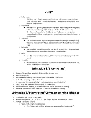 User stories describe functionality that is valuable to users from their perspective, not as technical specifications. They follow a Role-Action-Context format and involve cards for planning, conversations to flesh out details, and confirmations through testing. Stories should be independent, negotiable, valuable, estimable, small, and testable. Teams estimate story size in story points to help plan work for sprints. Tasks and acceptance criteria are created during sprint planning to clarify how a story will be implemented and tested.