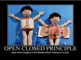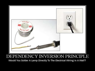 This document discusses SOLID principles for object oriented design. It begins with an introduction of the author and overview of topics to be covered. It then reviews basic OOP concepts and code smells to refactor. The main section defines the five SOLID principles: single responsibility, open/closed, Liskov substitution, interface segregation and dependency inversion. For each, it provides a definition, examples of conforming and non-conforming code, and discusses how it improves design. It closes with other agile/OOP principles and inviting questions.
