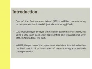 Laminated Object Manufacturing (LOM) is a sheet stacking process that builds 3D objects by bonding together successive layers of material. A laser cuts the cross-section patterns of each layer from a roll of paper or plastic sheet. The layers are then laminated together to form the final part one cross-section at a time.
