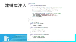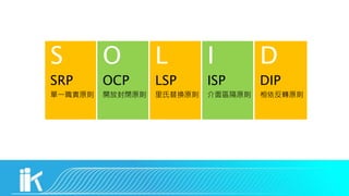 文档探讨了物件导向编程中的核心概念,如封装、继承和多态,强调高内聚与低耦合的重要性。它还介绍了依赖注入(DI)作为现代软件架构的核心概念,并提供了不同类型的服务注入方式。最后,建议通过学习SOLID原则来提高代码质量,减少编程中的困惑。