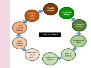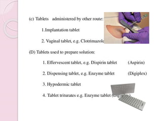 The document provides an overview of solid dosage forms, classifying them into various categories based on their intended use, such as powders, tablets, granules, and capsules. It details the preparation, advantages, and disadvantages of these dosage forms, emphasizing benefits like precise dosing and ease of formulation, while also noting challenges such as difficulty in swallowing for certain populations. Key types of solid dosage forms include effervescent granules, coated granules, and various powder applications, with specific mentions of their uses in medical and surgical contexts.