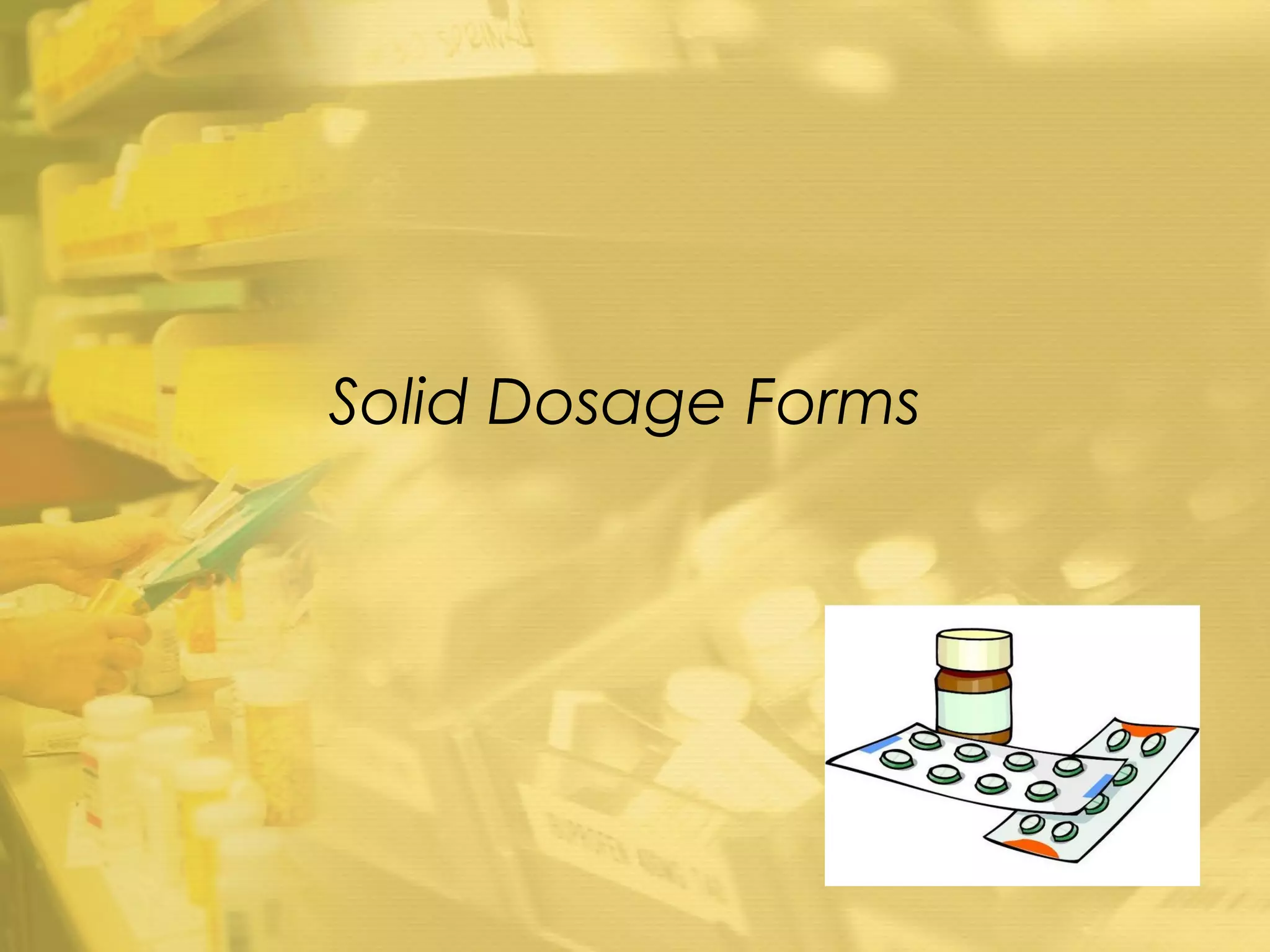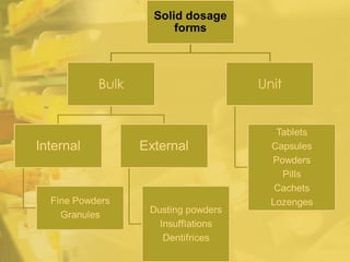 Powders are intimate mixtures of dry, finely divided drugs that range in size from 0.1 to 10 microns. Uniform particle size distribution ensures uniform dissolution, sedimentation, and minimizes stratification. Granules are made by blending powders and moistening to form a pasty mass that is dried. Capsules are solid oral dosage forms consisting of a shell and filling, while tablets are solid dosage forms containing medicinal substances with or without diluents. Other solid oral dosage forms include lozenges, troches, and pills.