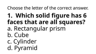 The document is a quiz focused on identifying properties of solid figures, including questions about faces, edges, vertices, and shapes. It includes multiple choice and true/false questions related to geometric concepts. Key topics covered include cubes, rectangular prisms, cones, cylinders, spheres, and pyramids.