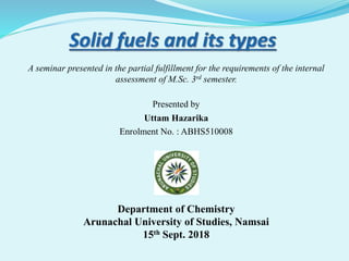 This document appears to be a seminar presentation summarizing solid fuels. It was presented by Uttam Hazarika to partially fulfill the requirements of an M.Sc. program. The presentation introduces different types of solid fuels, including primary solid fuels like wood and coal, as well as secondary solid fuels produced from coal and wood like coke, charcoal and briquettes. It discusses the advantages of solid fuels like low cost and ease of transport, as well as disadvantages like heat waste and combustion control issues. In conclusion, solid fuels have historically been important energy sources and coal remains a significant component of global fossil fuel reserves.