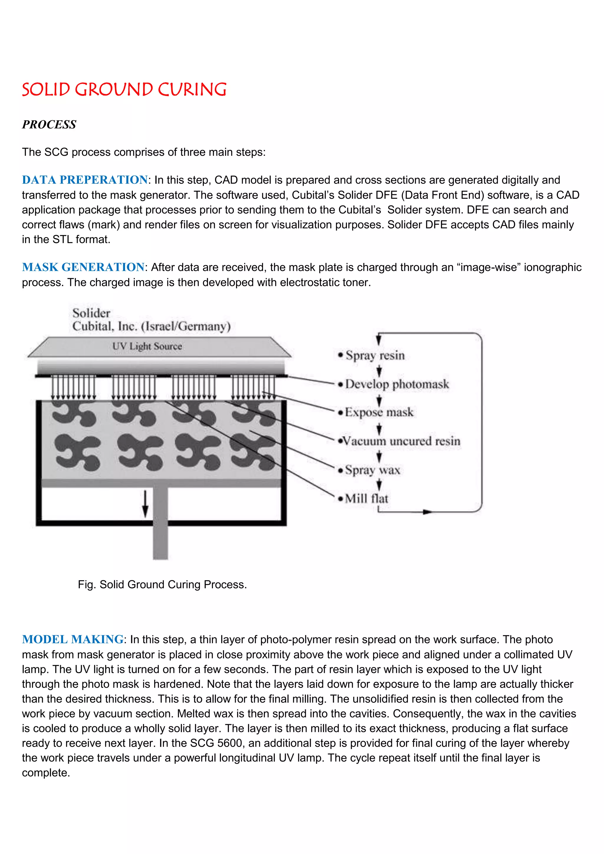 The SCG process has three main steps: data preparation where CAD models are prepared and cross sections generated for the mask generator, mask generation where the mask plate is charged and developed, and model making where thin resin layers are exposed to UV light through the photo mask, unsolidified resin is removed, wax is added to cavities and layers are milled to the exact thickness to build the 3D model layer by layer.