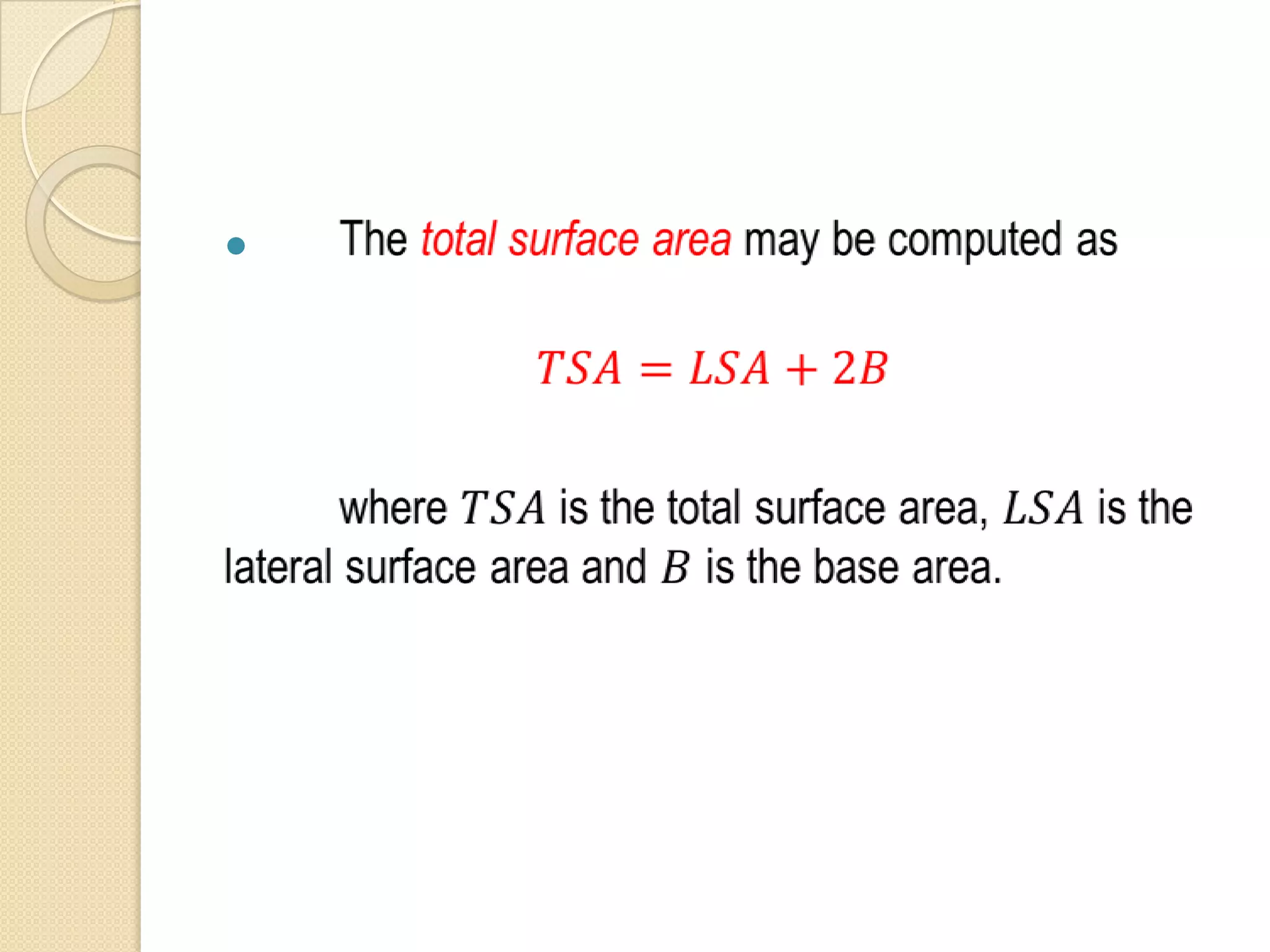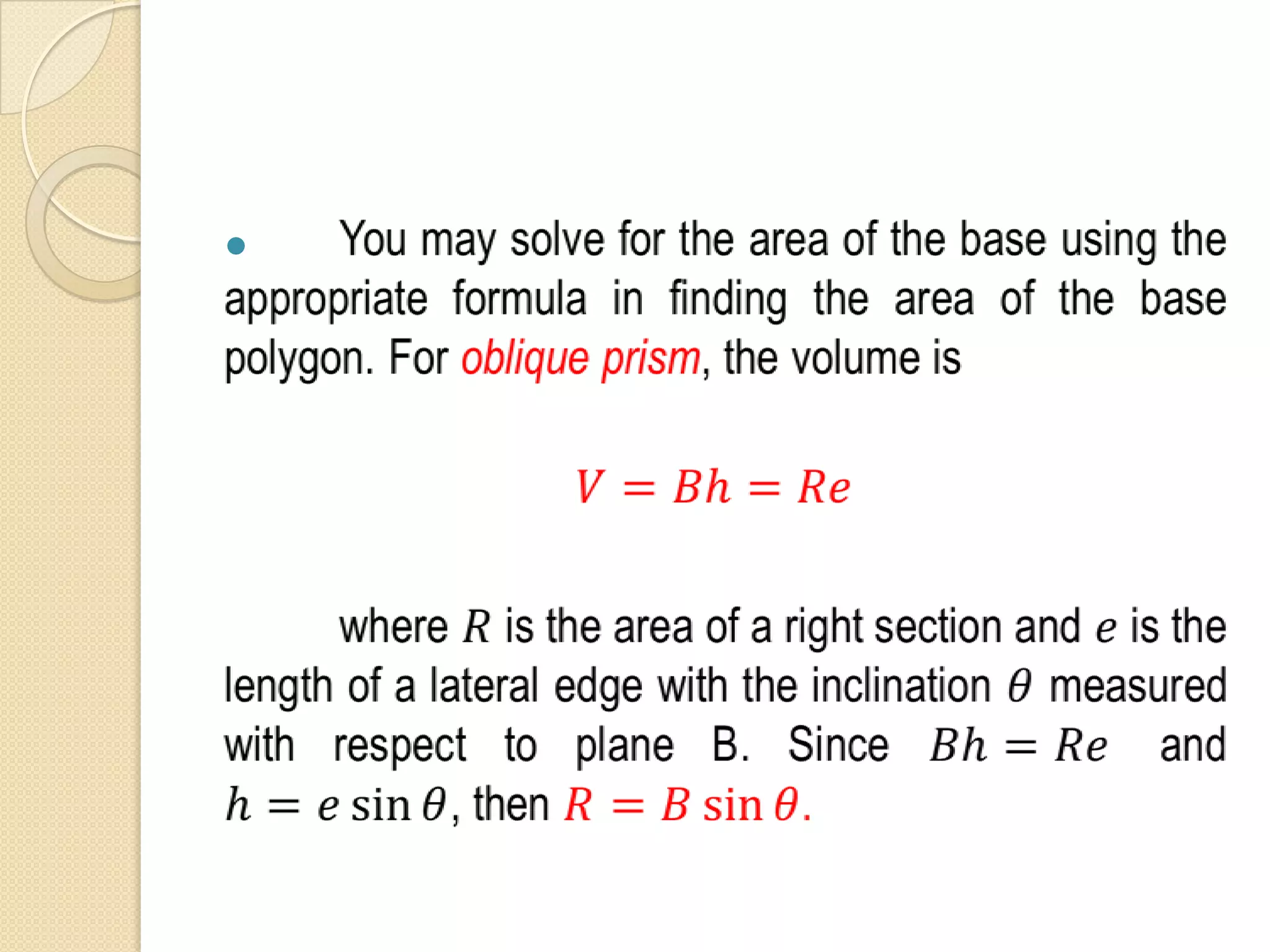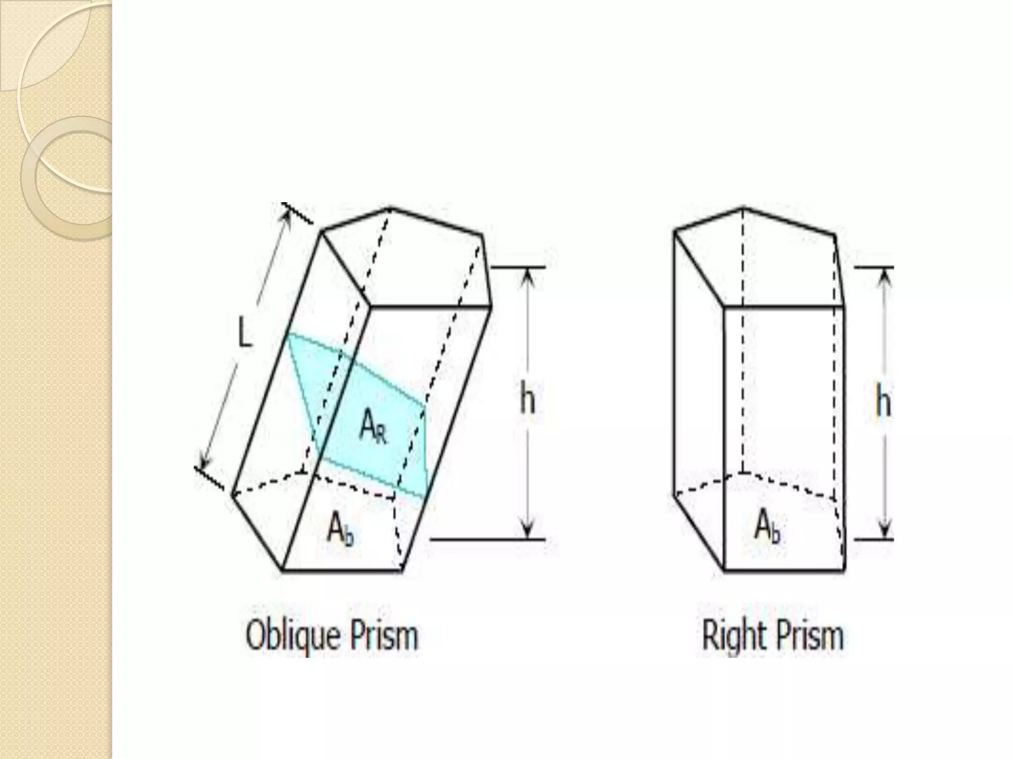 A prism is a polyhedron with two parallel, congruent bases. There are two types of prisms: oblique and right. An oblique prism has a non-perpendicular axis, while a right prism has an axis perpendicular to its bases. A prism has elements including bases, an altitude, an axis, lateral areas, lateral edges, right sections, and vertices. Formulas can be used to calculate a prism's properties like its total surface area, lateral area, volume, and more.