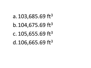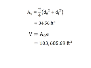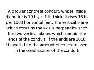 The document describes a circular concrete conduit that is 1 ft thick with an inside diameter of 10 ft. The conduit rises 16 ft per 1000 horizontal ft. It has ends that are 3000 ft apart. The question asks to calculate the amount of concrete used to construct this conduit.