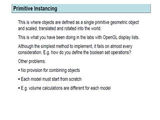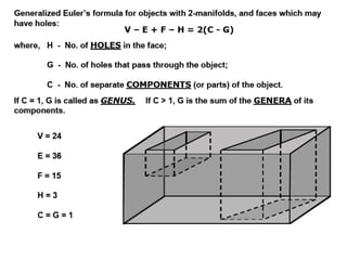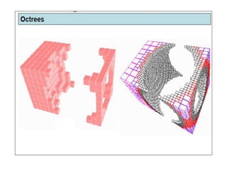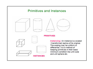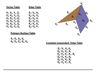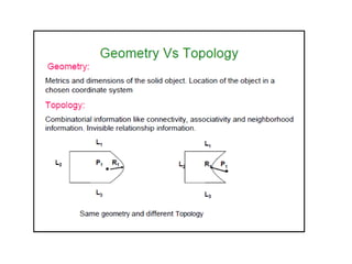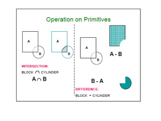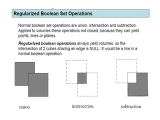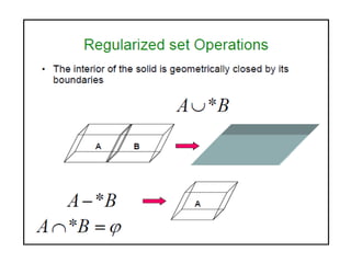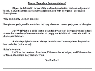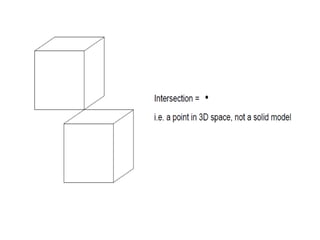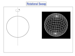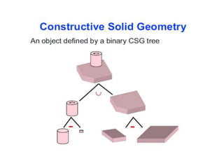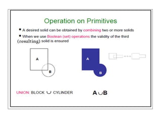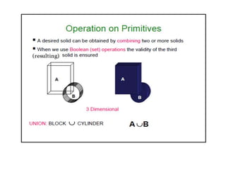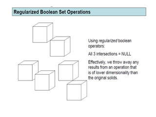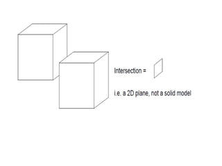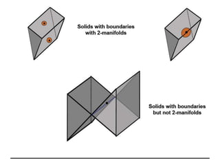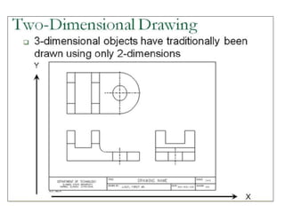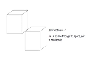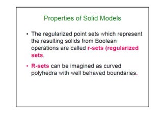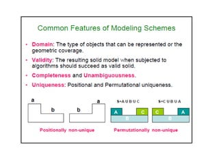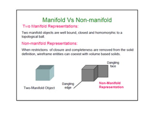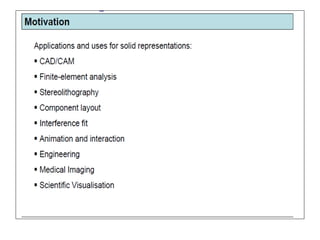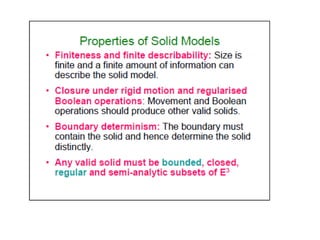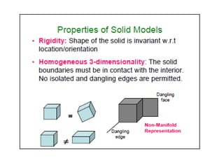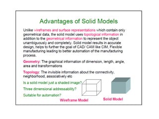 2D drawings are not ideal for representing 3D objects as they lack a Z axis. There are three main types of 3D models: wireframe, surface, and solid models. Wireframe models only contain edges and vertices and cannot represent complex surfaces. Surface models include edges, vertices and exterior surfaces but provide no interior details. Solid models are the current standard as they contain edges, vertices, exterior surfaces and interior details, providing an unambiguous representation of an object that can be used for engineering analysis.