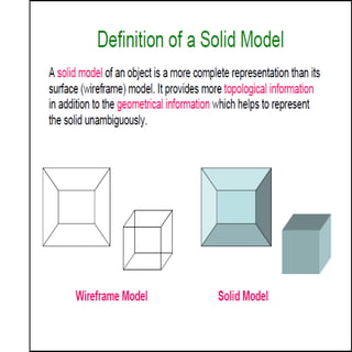 The document outlines various solid modeling schemes including definitions and representations such as boundary representation (B-rep) and constructive solid geometry (CSG), focusing on cell composition, spatial occupancy enumeration, and the significance of each in biomedical applications. It discusses the advantages and challenges of each representation method, emphasizing solid modeling's completeness and unambiguity. Furthermore, it highlights the use of primitives and boolean operations in CSG, detailing how complex models can be constructed through the combination of simpler shapes.