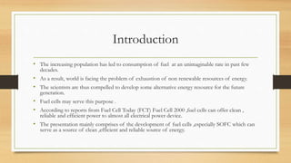 The document presents an overview of solid oxide fuel cells (SOFCs) as a clean and efficient energy source necessary due to the depletion of non-renewable energy resources. It discusses the functioning of fuel cells, their geometrical designs, materials used, and advancements for improving their applications. The conclusion emphasizes the potential of SOFCs as an alternative power source, highlighting their advantages and disadvantages.