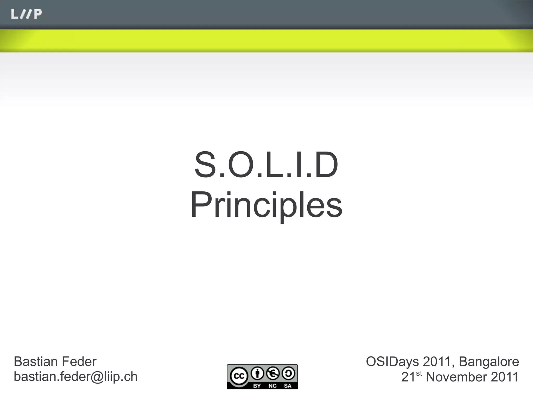 The document discusses the SOLID principles of object-oriented design: