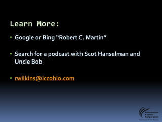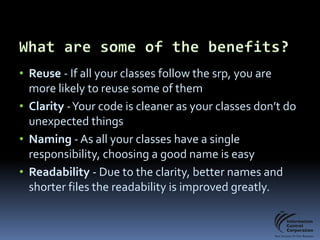 The document discusses the SOLID principles for software architecture, emphasizing the importance of single responsibility and the other principles to avoid 'spaghetti code.' It highlights the benefits of following these principles, such as improved code clarity, reusability, and readability, while acknowledging challenges in implementation. Overall, it underscores the necessity for organized, maintainable code structures in software development.