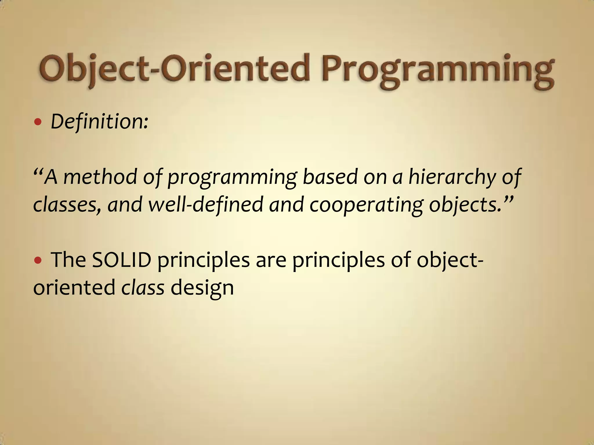 The document discusses object-oriented programming and design principles. It defines OOP as a programming paradigm based on classes and cooperating objects. It then discusses the SOLID principles of object-oriented design, which are guidelines for writing reusable, flexible and maintainable code. Specifically, it emphasizes that classes and methods should have a single responsibility, code should be open for extension but closed for modification, and software should be designed to be easy to test, change and add new features to.