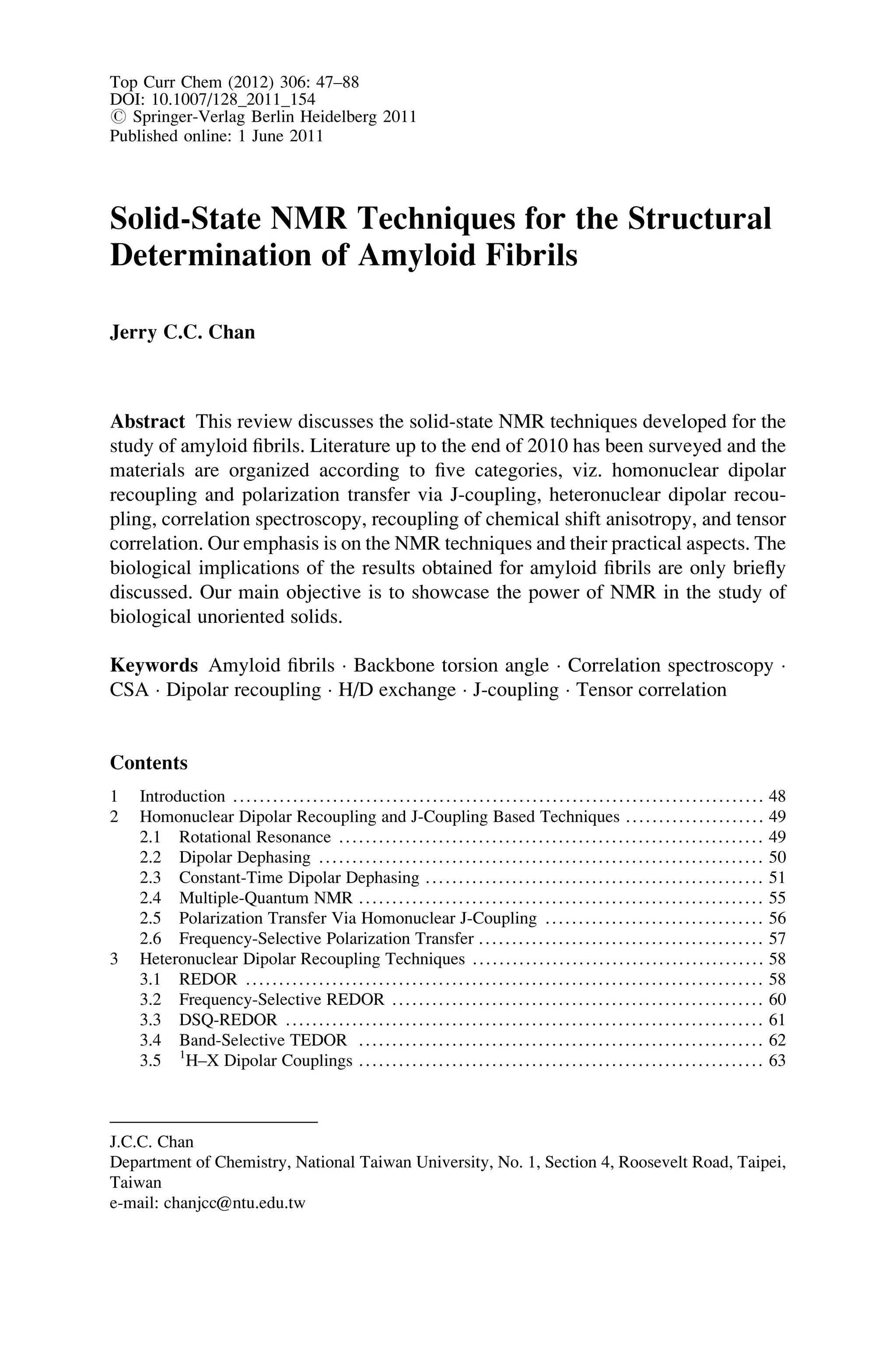 This document reviews solid-state NMR techniques that have been used to determine the molecular structures of amyloid fibrils. It discusses five categories of NMR techniques: 1) homonuclear dipolar recoupling and polarization transfer via J-coupling, 2) heteronuclear dipolar recoupling, 3) correlation spectroscopy, 4) recoupling of chemical shift anisotropy, and 5) tensor correlation methods. Specific techniques described include rotational resonance, dipolar dephasing, constant-time dipolar dephasing, REDOR, and fpRFDR-CT. These techniques have provided insights into the hydrogen-bond registry, spatial organization, and backbone torsion angles of amyloid fibrils.