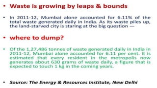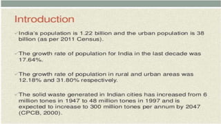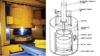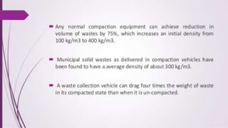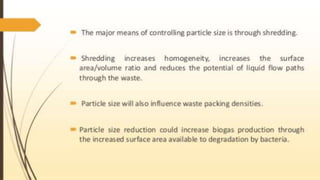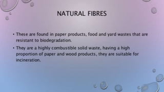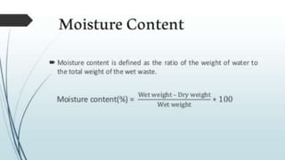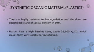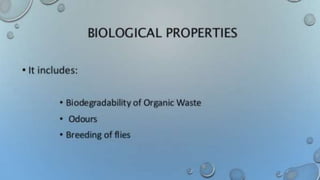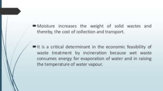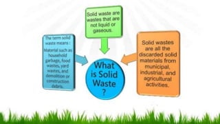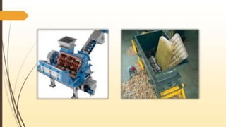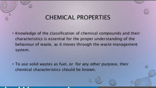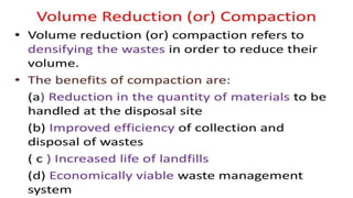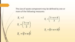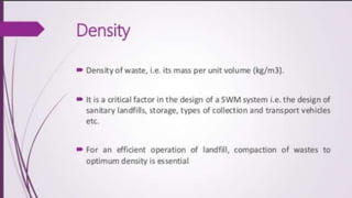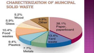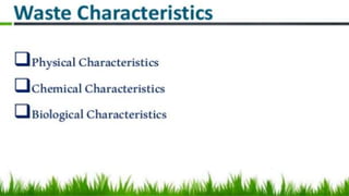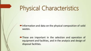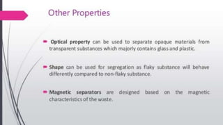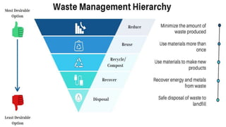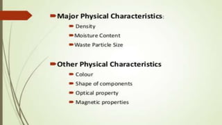 The document discusses solid waste characterization, which involves analyzing the composition of waste to aid in management and recycling efforts. It highlights processes like size reduction and waste minimization, emphasizing the waste hierarchy and the '3Rs' (reduce, reuse, recycle) as crucial strategies for efficient waste management and resource conservation. Overall, the document promotes understanding and improving waste processing techniques to minimize environmental impact and maximize resource use.