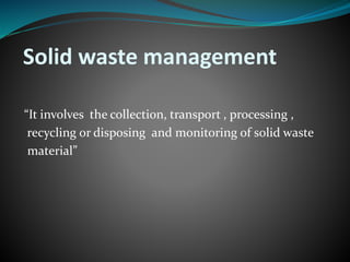 Solid waste management involves collecting, transporting, processing, recycling, or disposing of solid waste materials in a way that is safe for public health and the environment. Improper waste management can cause pollution, spread diseases, and create economic and social problems. The objectives of solid waste management are to reduce waste and toxins, increase recycling, maintain recycling programs, reuse materials, generate energy from waste, and properly dispose of waste. Common methods of managing waste include composting, incineration, and landfilling.