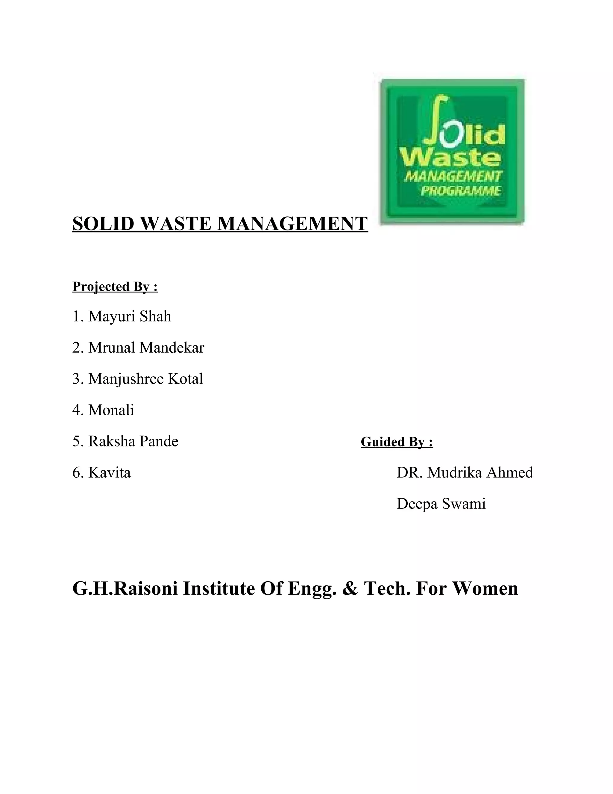 The document discusses solid waste management in India, highlighting its definition, classification, and challenges, including the rapid growth of waste generation and inadequate management practices. It details various types of waste, including domestic, industrial, and hazardous, and emphasizes the need for better collection, segregation, and processing methods. Additionally, it outlines regulations governing waste management and the responsibilities of local authorities in implementing these practices effectively.