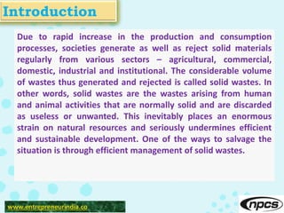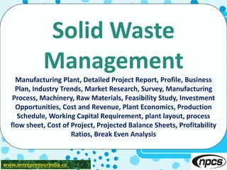 The document provides an overview of setting up a solid waste management plant in India. It discusses the growth in municipal solid waste generation and the need for improved management. It then outlines the various sections that would be included in a project report for a solid waste management plant, such as an introduction to the industry, waste collection and processing methods like composting, required approvals, machinery suppliers, financial projections, and sensitivity analysis. The document aims to address all relevant aspects of establishing a solid waste management business.