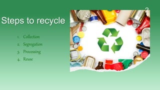 The document outlines steps for effective solid waste management, emphasizing the importance of collection, segregation, processing, and reuse. It suggests alternatives such as reducing single-use items and promoting eco-friendly products, along with methods for collecting and recycling various waste types. Proper waste segregation is highlighted as crucial for efficient recycling, necessitating public awareness and responsible disposal practices.
