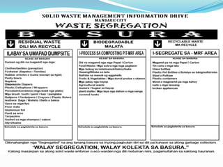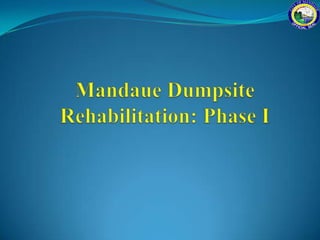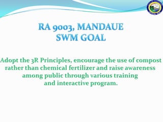 The document discusses the solid waste management program of Mandaue City. It outlines the city's receipt of clean city awards in 2000-2001 and the objective to improve its solid waste management program. It then provides details on the city's current and proposed waste management facilities and processes, including barangay-level waste separation, materials recovery facilities, a sanitary landfill, and waste-to-energy projects. Enforcement efforts and responsibilities of barangays are also summarized.