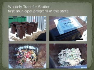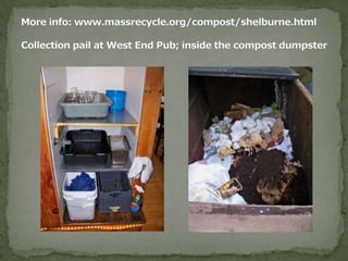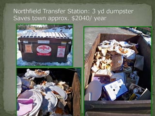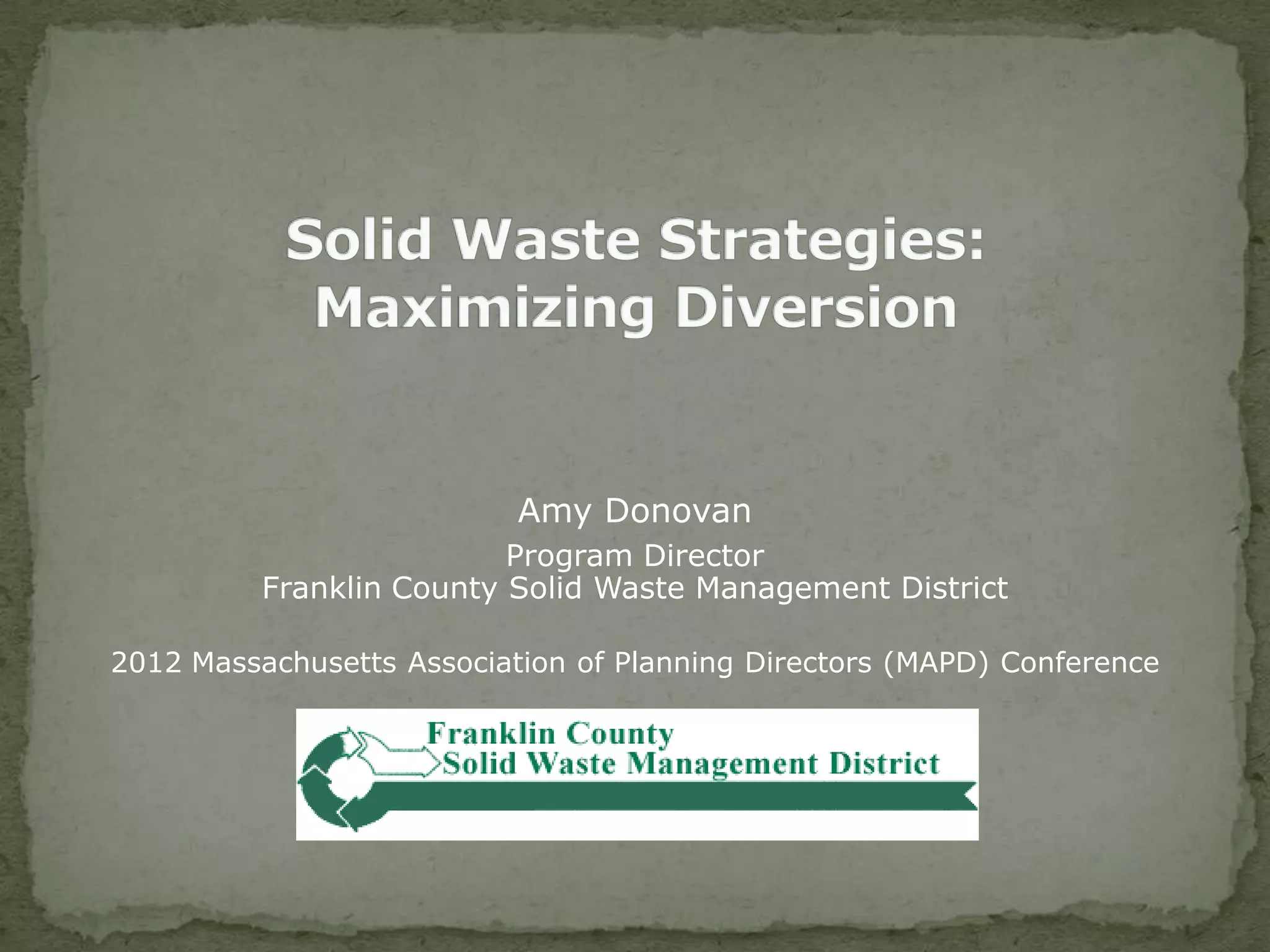 The Franklin County Solid Waste Management District provides waste management services to 22 municipalities in western Massachusetts. It coordinates regional programs like hazardous waste collection and education. The district received grants to start a food waste composting program and formed partnerships with farms to process compost. It aims to increase recycling and diversion rates through school and business organics collection programs.