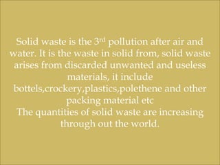 Solid waste is the third largest pollutant after air and water pollution. It comes from discarded materials like bottles, crockery, plastics, and other packaging that are in solid form. The amount of solid waste is increasing worldwide and comes from various sources such as households, industries, construction, hospitals, agriculture, and animals. Solid waste is classified into municipal solid waste, industrial waste, and biomedical waste.