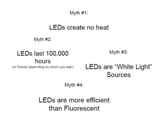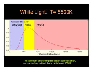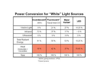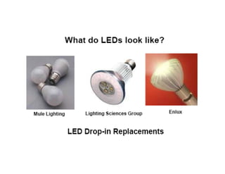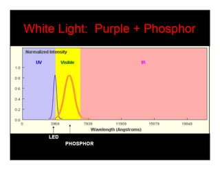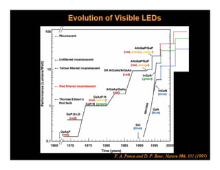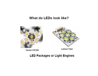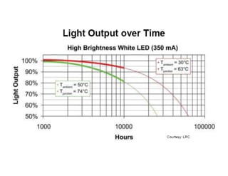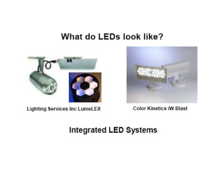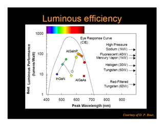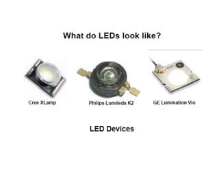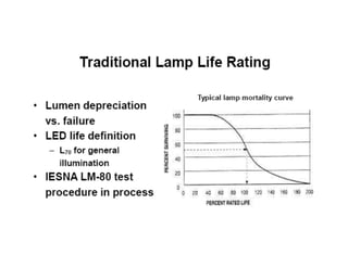 The document discusses solid-state lighting and LEDs, explaining their operation as opto-semiconductors that convert electrical energy into light. It highlights applications of LEDs across various fields such as automotive, mobile, and medical instrumentation, emphasizing their energy efficiency and reduced maintenance costs compared to traditional incandescent lamps. Additionally, it details characteristics such as color, intensity, and safety, while providing technical specifications for the use and testing of LEDs.