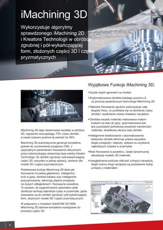 KOMPLETNE ROZWIĄZANIE CAM ZINTEGROWANE Z SOLIDWORKS Dzięki integracji w jednym oknie SolidCAM z SOLIDWORKS, wszystkie operacje mogą być definiowane, obliczane i weryfikowane bez opuszczania okna SOLIDWORKS. Wszystkie geometrie 2D i 3D użyte w obróbce są w pełni asocjatywne z modelami SOLIDWORKS. Jeśli zmienisz model, wszystkie operacje CAM będą automatycznie aktualizowane. W każdej części CAM można używać wielu konfiguracji, a każda z nich może odpowiadać poszczególnym krokom obrabianego przedmiotu. iMACHINING 3D – OSZCZĘDŹ 70% CZASU OBRÓBKI 3D iMachining automatycznie generuje kompletne, gotowe do uruchomienia programy CNC, z optymalnymi parametrami frezowania obliczonymi przez wykorzystujący ekspercką bazę wiedzy Kreator Technologii, do obróbki zgrubnej i pół-wykańczającej części 3D, wszystko w jednej operacji, zarówno dla modeli 3D jak i części pryzmatycznych!
