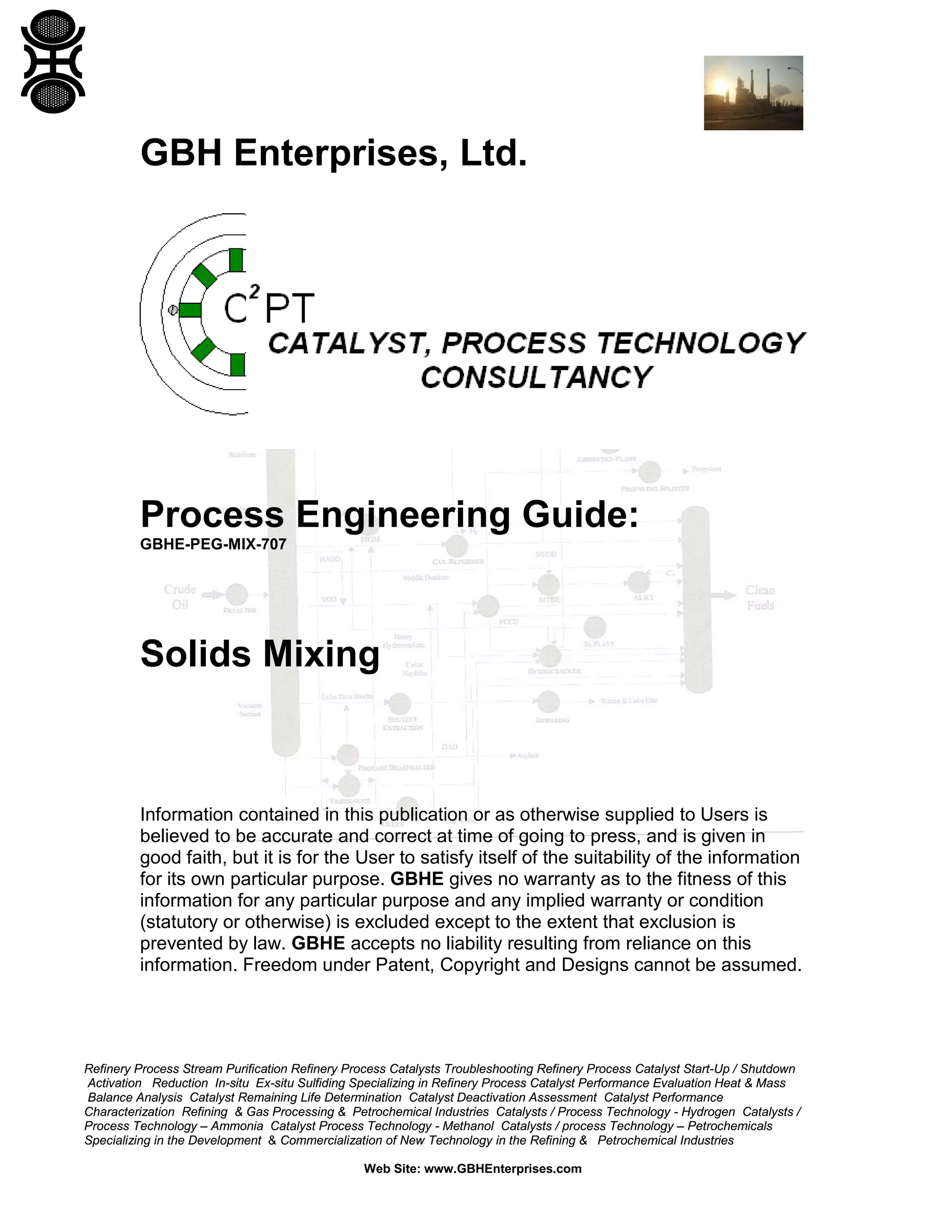 This document provides guidance on mixing dry particulate solids. It discusses key differences between mixing solids versus liquids and gases. Namely, solids have no diffusion, particle properties can cause non-random movement, and particles are much larger than molecules. The document also covers qualitative and quantitative ways to assess mixture quality, such as scale of segregation and variance. It provides equations to calculate the theoretical best mixture quality based on formulation and scale of scrutiny. Selection of an appropriate mixer depends on whether the solids are free-flowing or cohesive. Sampling methods are important to properly assess mixture quality.