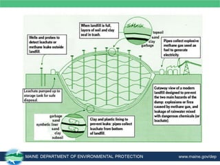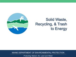 The document discusses Maine's solid waste hierarchy which prioritizes reducing, reusing, recycling, composting, processing waste for beneficial uses, waste-to-energy, and landfilling as a last resort. It provides details on strategies for reducing, reusing, recycling, and composting materials to prevent waste from piling up. The document also explains waste-to-energy facilities that combust solid waste to generate electricity and how modern landfills are constructed and operated to strict environmental standards.