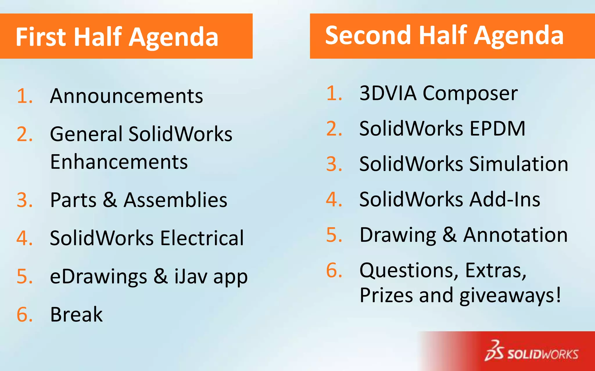 This presentation summarizes the new features and enhancements in SolidWorks 2013. It is split into two halves, with the first half covering announcements, general SolidWorks enhancements, parts and assemblies, electrical, eDrawings, and a break. The second half discusses 3DVIA Composer, EPDM, simulation, add-ins, drawings, and takes questions. Attendees can text questions and win prizes by answering trivia or scanning QR codes. The presentation emphasizes new tools for faster design, improved performance, and enhanced collaboration capabilities in SolidWorks 2013.