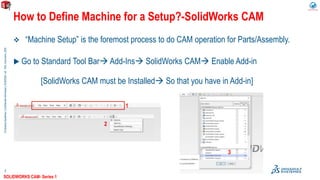 This document discusses how to define a machine for a setup in SolidWorks CAM. It explains that the first step is to enable the SolidWorks CAM add-in. It then describes how to open a part model and select "Define Machine" in the command manager or feature tree to start defining the machine. It also discusses how to customize machine data by launching the Technology Database and either modifying an existing machine or creating a new one by copying an existing one and defining parameters.
