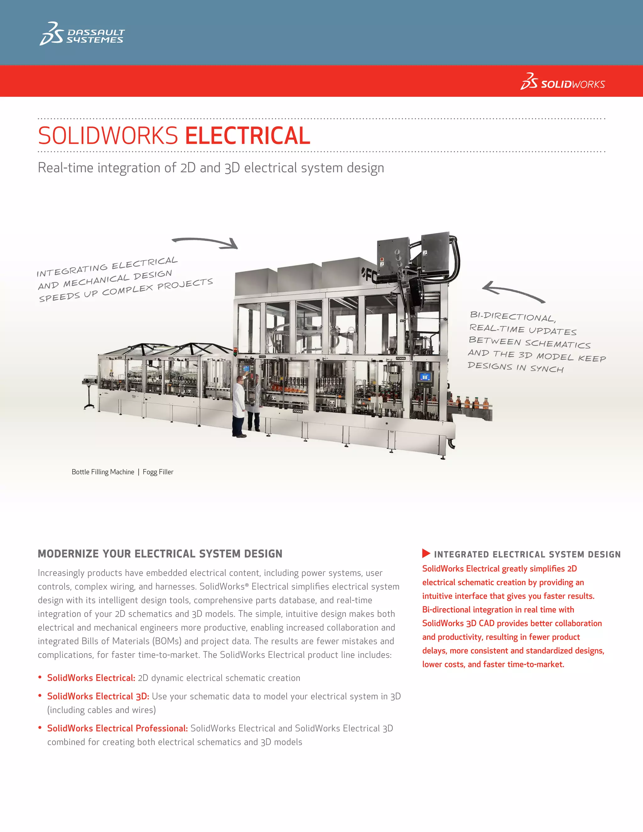SolidWorks Electrical streamlines the integration of 2D and 3D electrical system design, allowing for real-time updates and collaboration between electrical and mechanical teams. The software includes features such as a comprehensive library of electrical parts, automated schematic generation, and tools for efficient design processes, reducing errors and time-to-market. By synchronizing designs and providing intuitive interfaces, SolidWorks Electrical enhances productivity and standardization in project development.