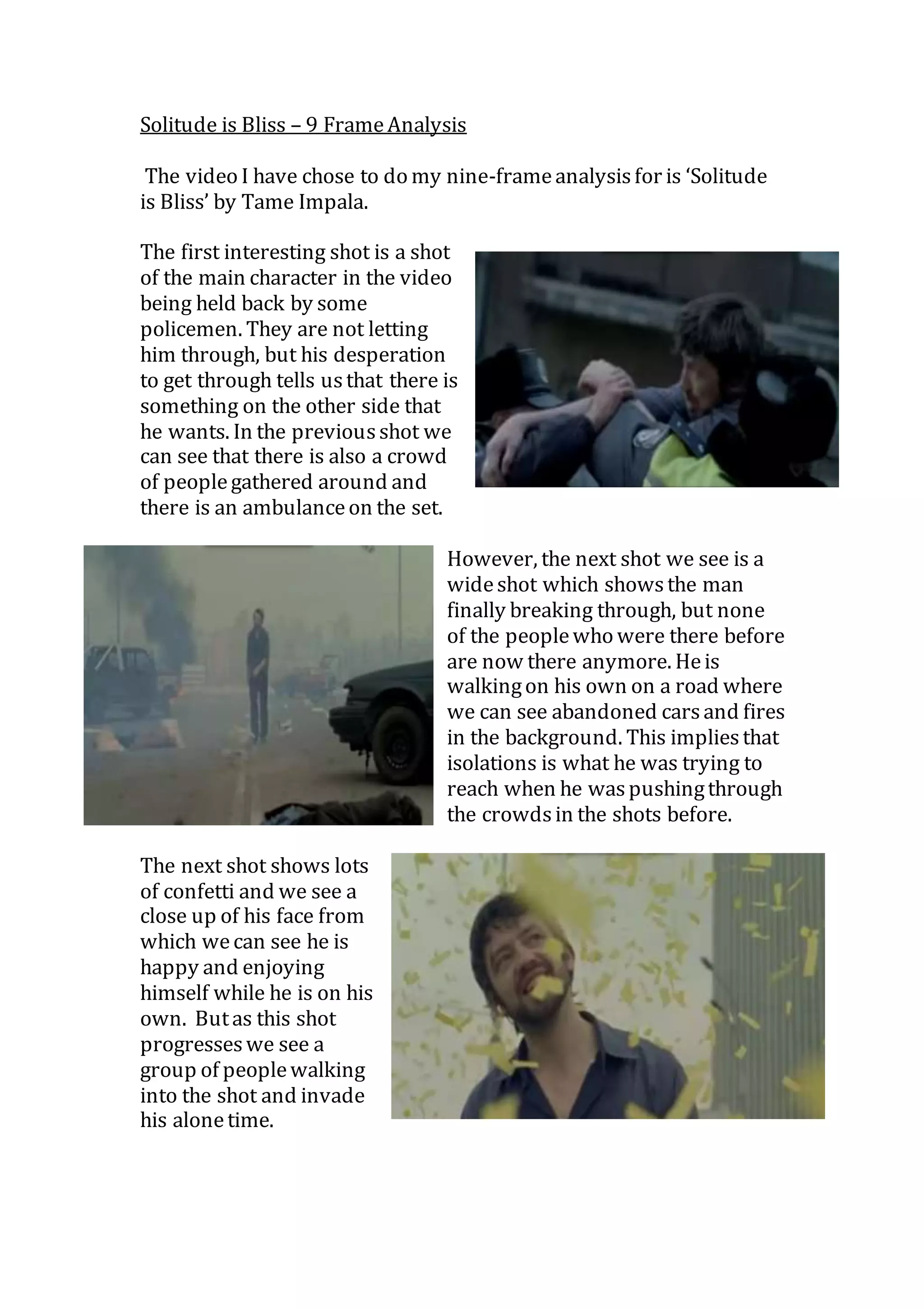 The document provides a nine-frame analysis of the music video "Solitude is Bliss" by Tame Impala. In the first frame, a man is held back by police from getting to the other side, where he desires to be alone. In later frames, he breaks through and is alone on an abandoned road enjoying confetti, but then a group invades his solitude. Subsequent frames show the man expressing power by pretending to shoot someone and kicking another person on the ground. The analysis concludes by returning to the beginning frame, with the man again being held back while looking angry and upset at losing his solitude.