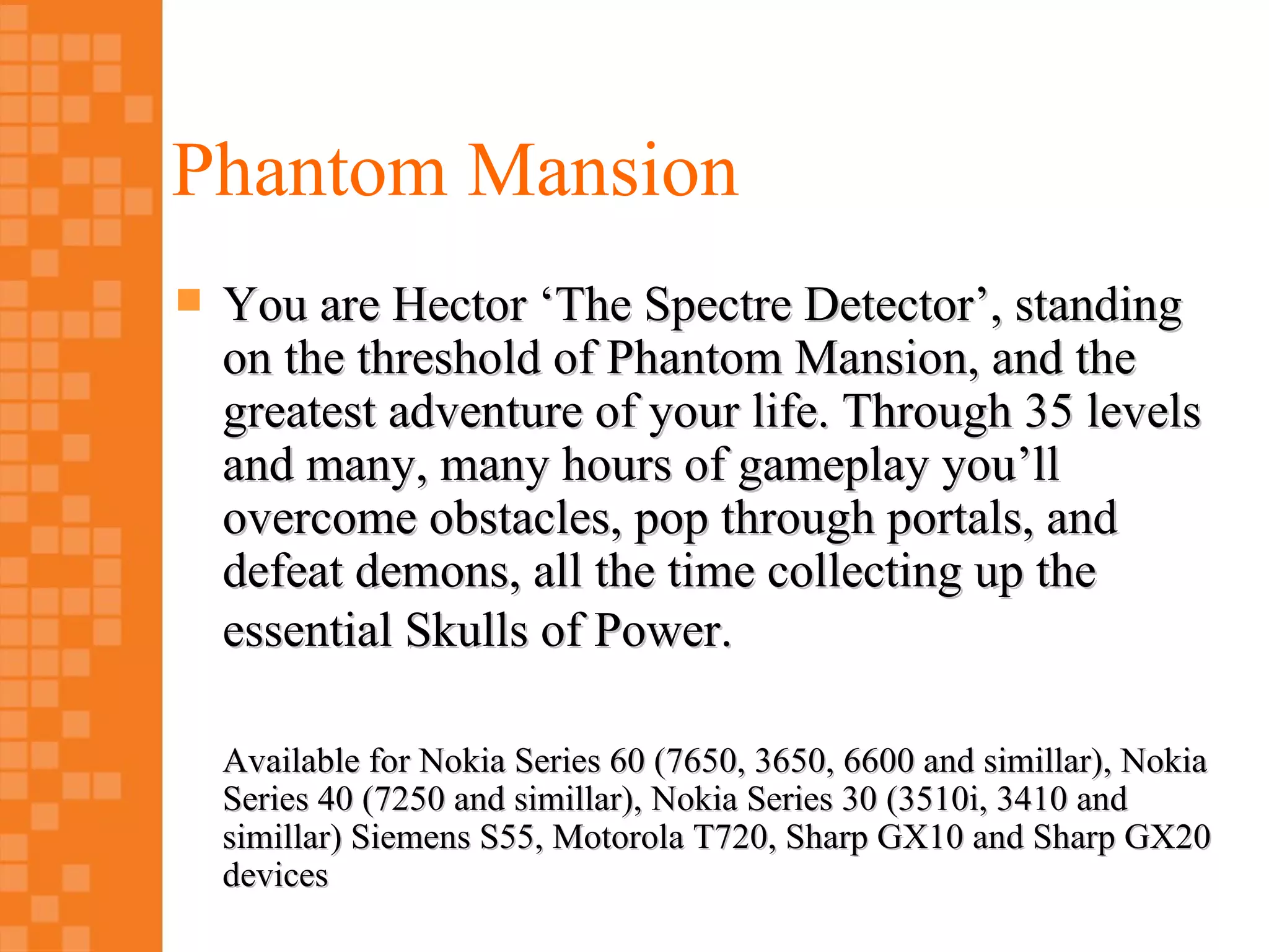 The document summarizes a catalog of mobile games available across different phone platforms. It provides descriptions of 14 games, including Phantom Mansion, Antivirus, Thunder Thumbs, Pass Ball, Wizard Pinball, Keep-a-Head, Frankie Jumpy, Krazy Drops, Link-it, Scientist Code, Small Faces, Space Explorer and mentions there are additional games available upon request. It also notes that games are available in English and Spanish with other languages available upon request, and some games are also compatible with Mophun or BREW technologies. Contact information is provided at the end for the CEO of the company.
