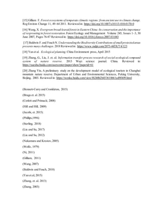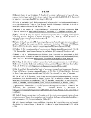 This document contains references for research related to tropical rainforests and human impacts on ecosystems. It discusses the richness of tropical forests and how plants and animals have adapted to them. It also addresses human impacts on ecosystems through climate change and local communities in places like the Pacific islands and Asia/China. The document outlines ecological planning for nature reserves, including their ecosystem structure and functions. It discusses community ecosystem planning and ecological cycle systems. Finally, it examines resident participation mechanisms in nature reserves and the need to improve tourism.