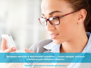 Документ описывает мобильное приложение Soloten, предназначенное для интернет-магазинов, которое упрощает процесс покупок с помощью смартфонов. Он подчеркивает преимущества использования мобильного решения для компаний, включая удобный доступ к информации об акциях и программу повышения эффективности бизнеса. Soloten представляет собой комплексный подход к разработке и продвижению продуктов с международной командой экспертов.