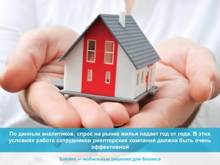 Документ описывает мобильную CRM систему для риелторов от компании Soloten, которая направлена на повышение эффективности работы в условиях падающего спроса на рынке жилья. Программа позволяет централизованно управлять клиентами и документацией, а также генерирует отчеты о производительности сотрудников. Soloten предлагает комплексные решения, включая стратегию разработки и внедрения, с целью улучшения бизнес-процессов риелторских компаний.