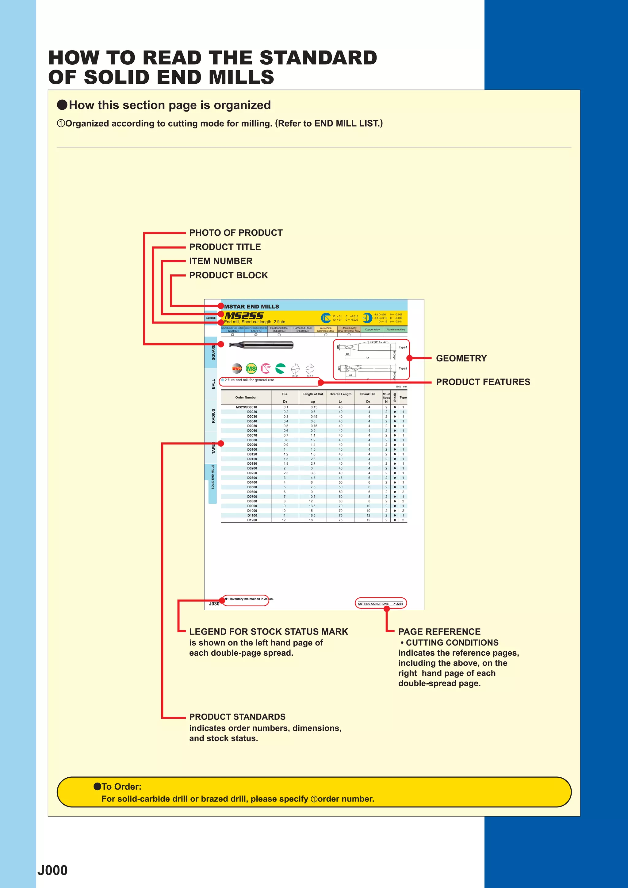 The document provides information on how to read the standard for solid end mills. It is organized according to cutting mode for milling. The order number identifies the end mill type, number of flutes, dimensions, features, coating, and other specifications. Symbol descriptions provide information on tool materials and coatings.