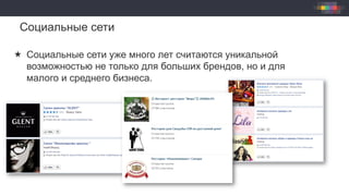 Документ описывает топ-10 способов продвижения малого бизнеса в социальных сетях, подчеркивая их важность для достижения успеха. Он выделяет использование рекламных методов, креативов и анализа целевой аудитории как ключевые инструменты для увеличения продаж и привлечения клиентов. Социальные сети являются мощным каналом для взаимодействия с клиентами и формирования лояльности, что делает их критически важными для выживания малого бизнеса в современном мире.