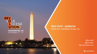 Solr anti-patterns discusses common issues when migrating from older Solr versions to newer ones, including improperly configured request handlers, indexing errors, and lack of configuration for threads and caching. The document provides recommendations for updating configurations to address these issues, such as using newer field types, configuring thread pools, and tuning cache sizes and refresh settings.