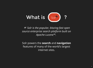 The document provides an overview of Solr, an open-source enterprise search platform built on Apache Lucene, highlighting its key features such as reliability, scalability, and fault tolerance. It explains how Solr works, including concepts like inverted indexing, relevancy calculation, and document-oriented data handling. Additionally, it outlines various use cases, capabilities such as geospatial and multilingual support, and cautions against using it for deep analytic tasks.
