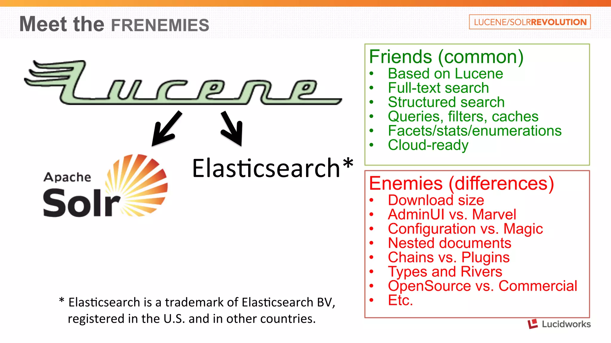 Solr and Elasticsearch are both based on Lucene and provide full-text search and structured search capabilities. They differ in areas like configuration, indexing documents, and representing search parameters. Both allow indexing and searching large volumes of documents and facilitating fast and complex queries.