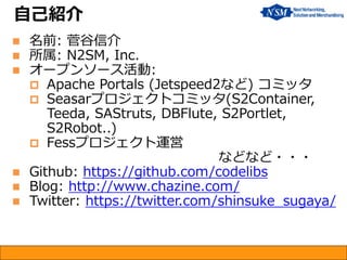 所属: N2SM, Inc. オープンソース活動: Apache Portals (Jetspeed2など) コミッタ Seasarプロジェクトコミッタ(S2Container, Teeda, SAStruts, DBFlute, S2Portlet, S2Robot..) Fessプロジェクト運営 などなど・・・ Github: https://github.com/codelibs Blog: http://www.chazine.com/ Twitter: https://twitter.com/shinsuke_sugaya/ 自己紹介
