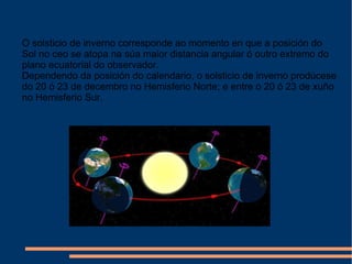O solsticio deinverno corresponde ao momento en que a posición do Sol no ceo se atopa na súa maior distancia angular ó outro extremo do plano ecuatorial do observador. Dependendo da posición do calendario, o solsticio de inverno prodúcese do 20 ó 23 de decembro no Hemisferio Norte; e entre o 20 ó 23 de xuño no Hemisferio Sur.