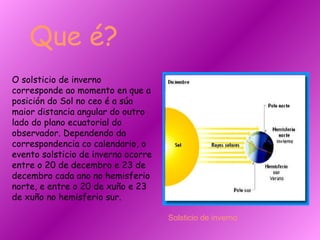 O solsticio deinverno corresponde ao momento en que a posición do Sol no ceo é a súa maior distancia angular do outro lado do plano ecuatorial do observador. Dependendo da correspondencia co calendario, o evento solsticio de inverno ocorre entre o 20 de decembro e 23 de decembro cada ano no hemisferio norte, e entre o 20 de xuño e 23 de xuño no hemisferio sur. Que é? Solsticio de inverno