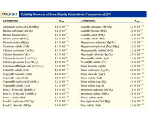 This document appears to contain information about solubility equilibria and the solubility product constant (Ksp). It provides examples of solubility equilibria expressions for binary and ternary salts dissolving in water. It also discusses how the value of Ksp relates to the solubility of salts, noting that Ksp values can only be used to directly compare the solubility of salts that contain the same number of ions. The document provides examples of calculating Ksp values from known solubility values and vice versa.